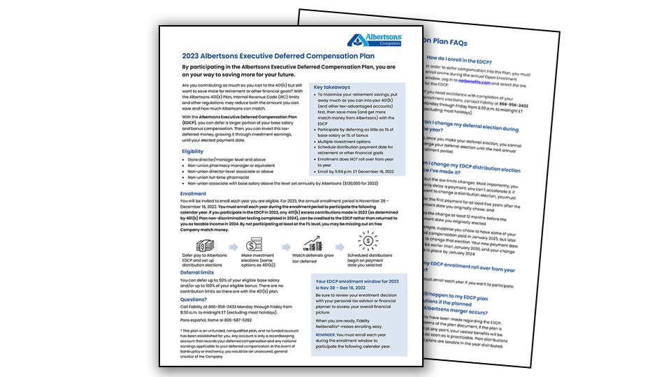 Enroll in the Albertsons Companies 2026 Executive Deferred Compensation Plan (EDCP) during the enrollment window between Nov. 17 and Dec. 12, 2025. You must enroll each year to participate the following calendar year.