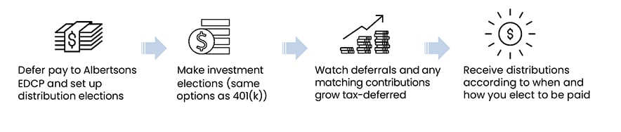 With the Albertsons Executive Deferred Compensation Plan (EDCP), you can defer a larger portion of your base salary and bonus compensation. Then, you can invest this tax-deferred money, growing it through investment earnings, until your elected payment date.